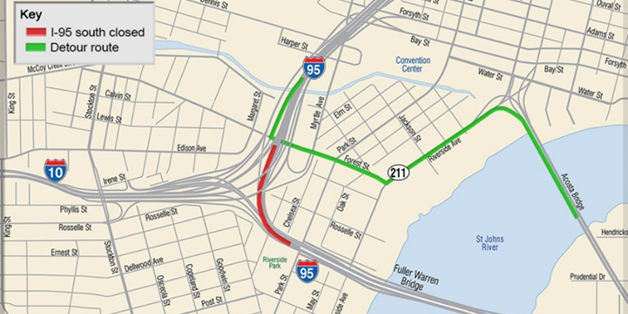 I-95 South Detour: Drivers on I-95 south approaching the Fuller Warren Bridge will detour to the Forest Street exit, left on Forest Street, left on Riverside Avenue and take the Acosta Bridge to rejoin I-95 southbound.