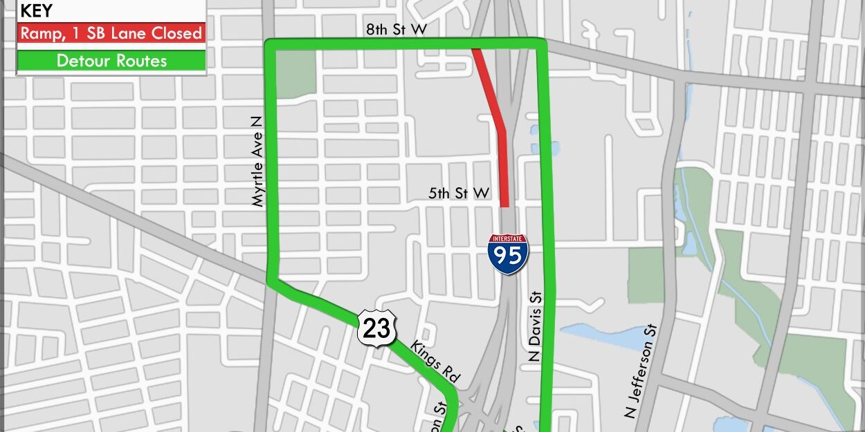 JACKSONVILLE, Fla. – One southbound lane of I-95 from 8th Street to south of West 5th Street, including the 8th Street on-ramp to I-95 southbound, will close at approximately 10 p.m. Friday, September 9, for bridge deck repairs on the I-95 West 5th Street overpass. The closures will be in place for approximately two weeks. For the 8th Street ramp closure, traffic will detour to either Myrtle Avenue North and Kings Road/Union Street or North Davis Steet and State Street to I-95 southbound.