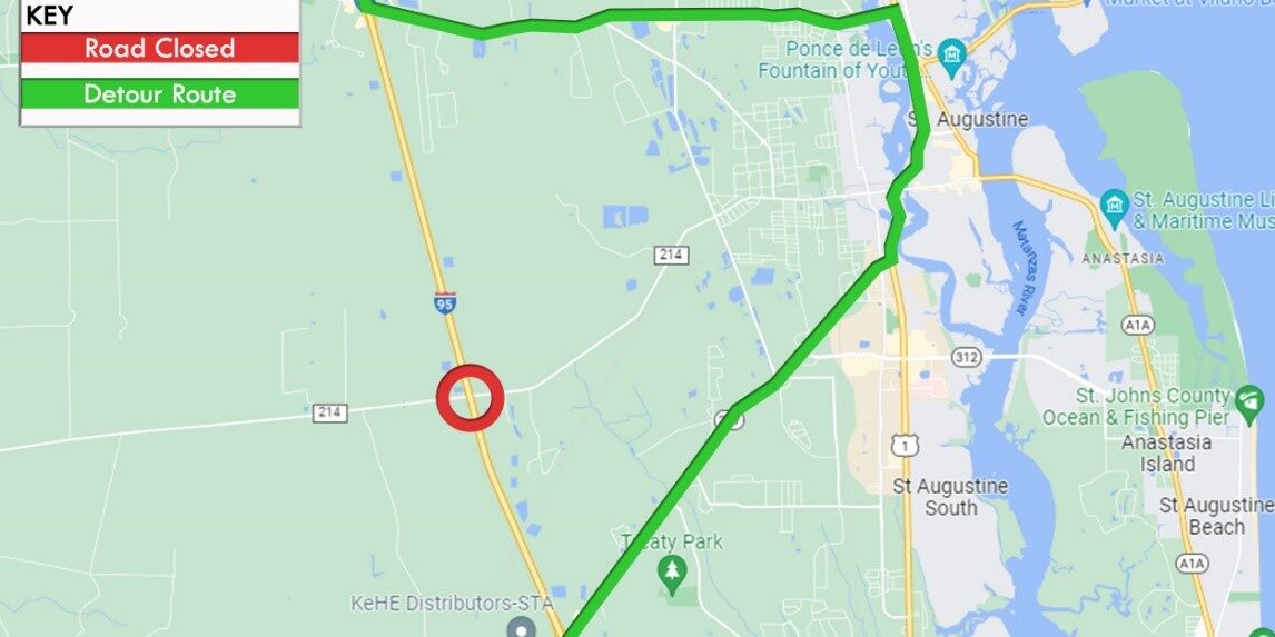 ST. AUGUSTINE, Fla. – As part of an emergency construction contract to replace the County Road 214 overpass beam at I-95 southbound, motorists can expect lane closures and detours in the area throughout the month of January.