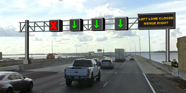 Construction along the I-295 West Beltway at the Buckman Bridge is part of a safety initiative to convey which lanes are free flowing, slowed or blocked on the bridge. Programable overhead electronic boards and additional CCTV cameras will be installed at several locations, on both directions of the bridge to support lane use, improve traffic flow and enhance safety.