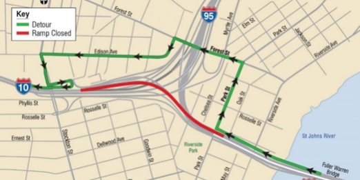 I-10 East Detour: Tuesday, June 28 from 10:30 p.m. to 5:30 a.m., drivers on I-10 east who wish to access I-95 south will be detoured north to the Union Street exit, right on Jefferson Street to connect with the Acosta Bridge and rejoin I-95 southbound.