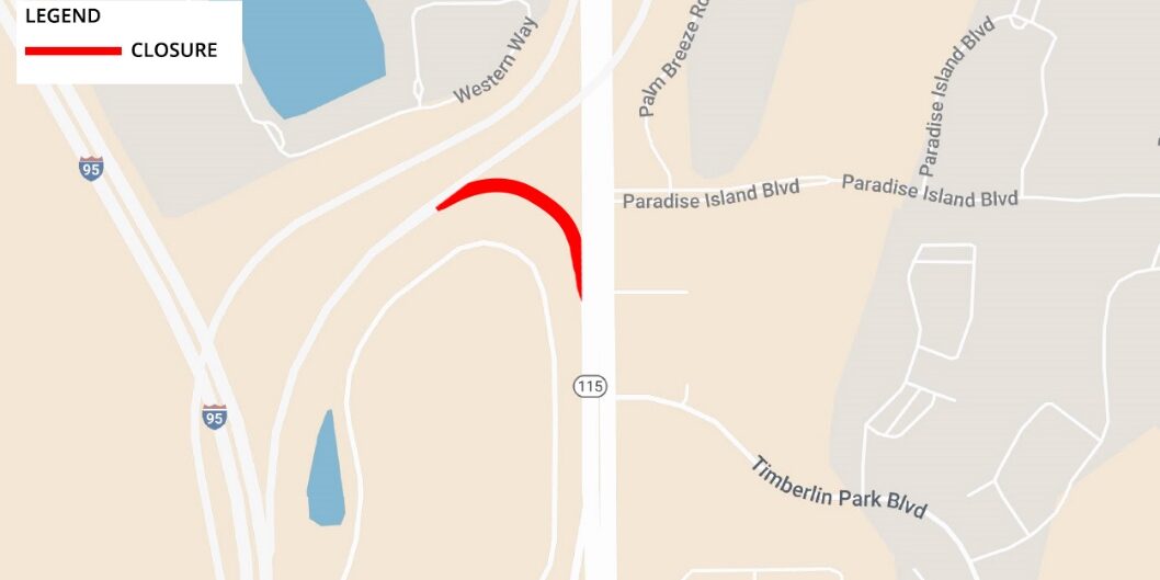 JACKSONVILLE, Fla. – As part of resurfacing improvements on Southside Boulevard (State Road 115) from Butler Boulevard (State Road 202) to U.S. 1 (Philips Highway), a detour of the Southside Boulevard southbound exit ramp from I-95 North is scheduled this weekend. The detour will occur on Sunday, March 10 from 9:30 p.m. to 6 a.m. the following morning.
