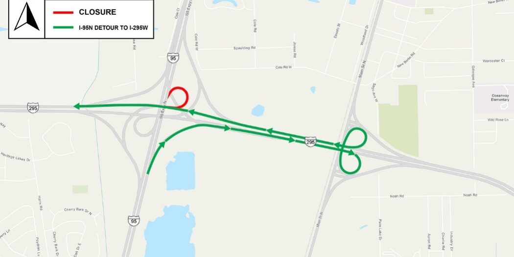 - I-95 North to I-295 West ramp closed: The exit ramp from I-95 North to I-295 West will close while crews construct roadway widening. Drivers will detour to I-295 East and take U.S. 17 north to access I-295 West.