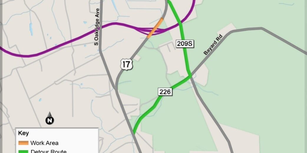 During the closures, motorists traveling on U.S. 17 will be detoured approximately three miles via Bayard Road and County Road 209 as shown in the map below.